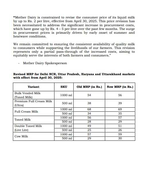 New Delhi, April 30, 2025 – Inflation just got a little more personal for Delhi-NCR households. Mother Dairy, a leading milk supplier in the region, announced a ₹2 per litre price hike across various milk categories, citing rising procurement costs and seasonal supply disruptions. The new rates took effect this morning, impacting consumers across Delhi, Uttar Pradesh, Haryana, and Uttarakhand.