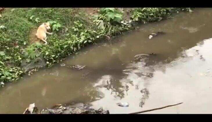 Vadodara: In a rare and shocking event, a crocodile was captured on camera hunting a dog in the Vishwamitri River, which flows through the Pratapganj area of Vadodara.